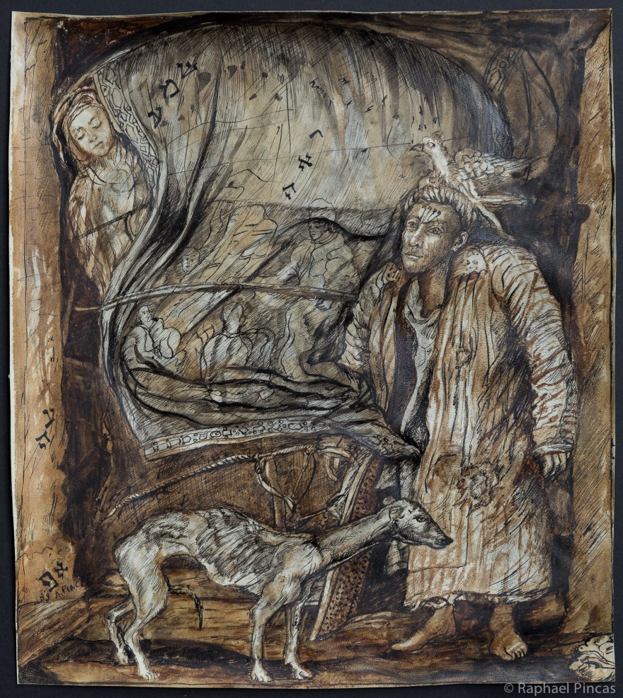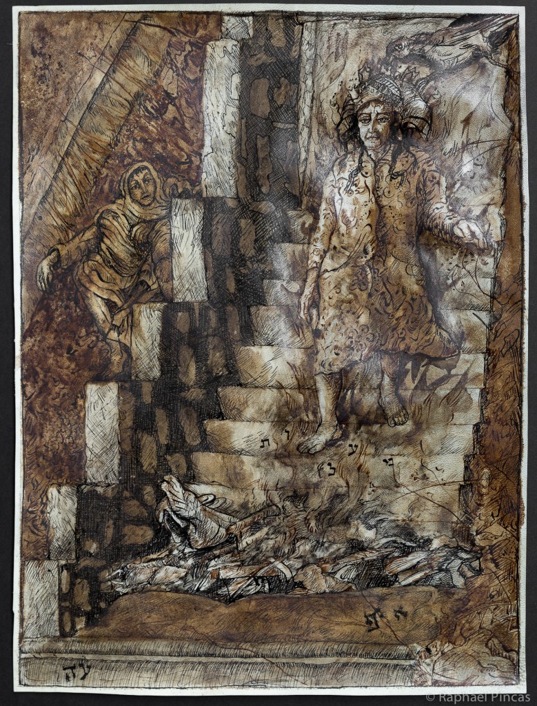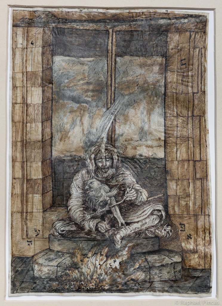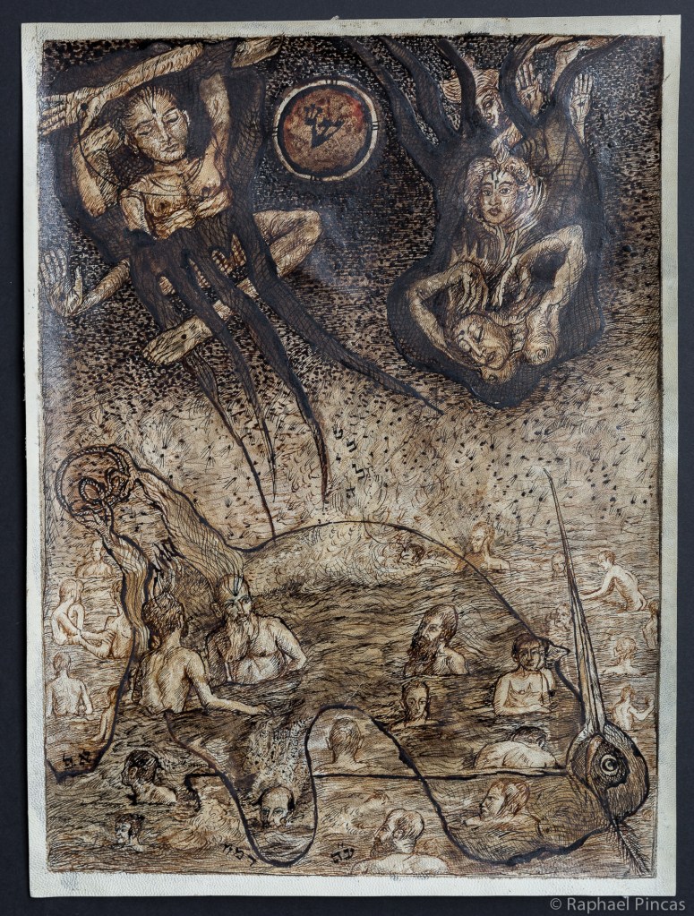Dans ces compositions qui nous plongent dans des scènes énigmatiques, la présence de lettres hébraiques participent à l’expérience visuelle et mystique.