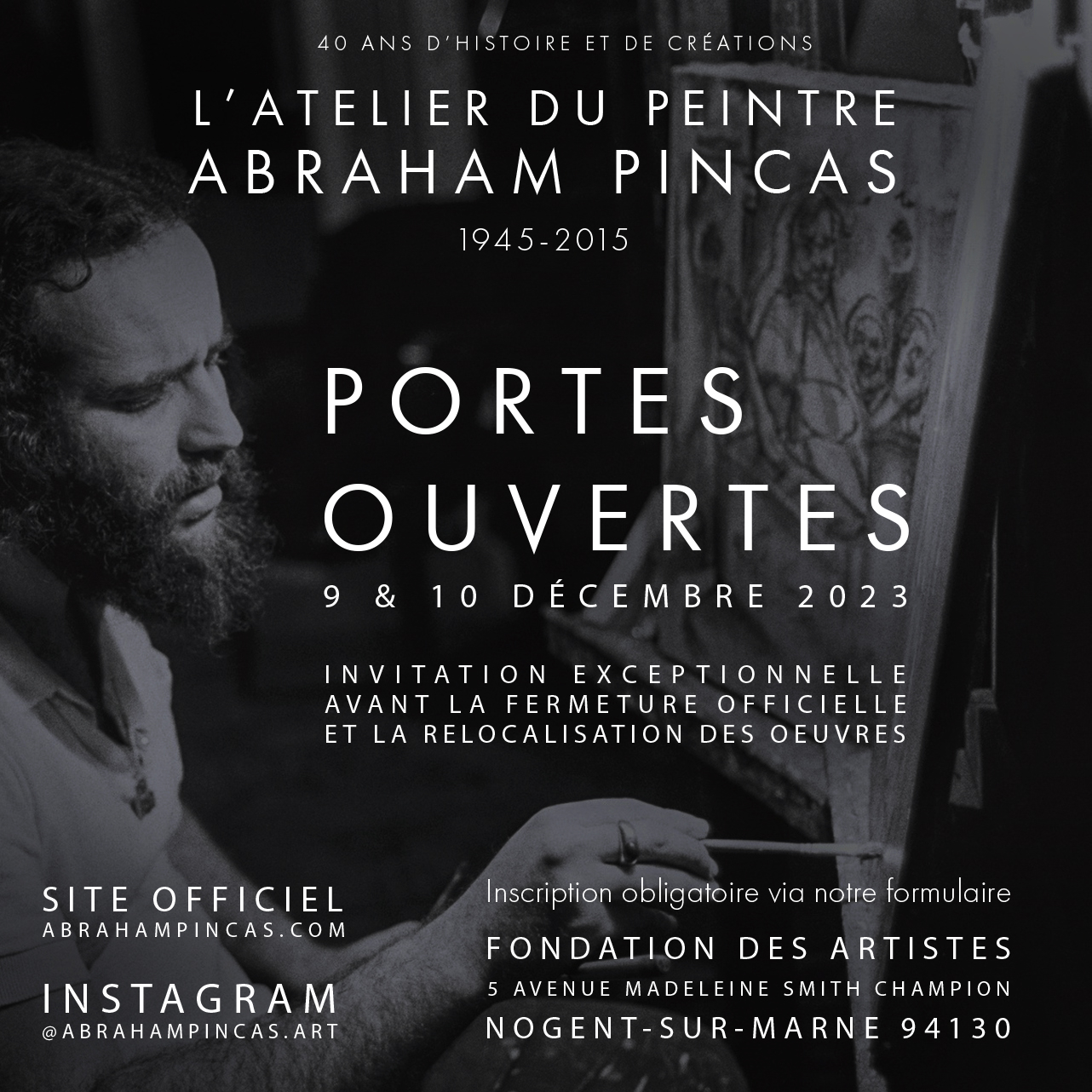 À l’approche de la fermeture officielle de l’atelier historique d’Abraham Pincas, nous vous invitons aux Portes Ouvertes le 9 & 10 décembre 2023 de 10h à 18h à la Fondation des Artistes de Nogent-Sur-Marne.