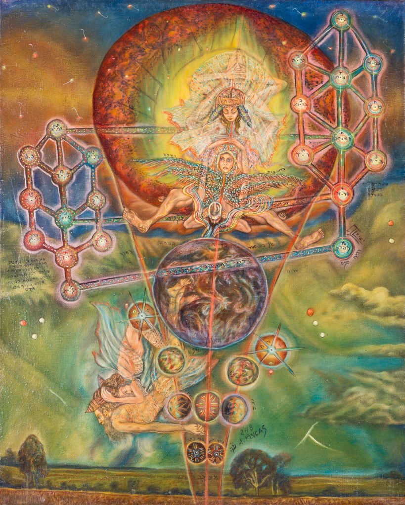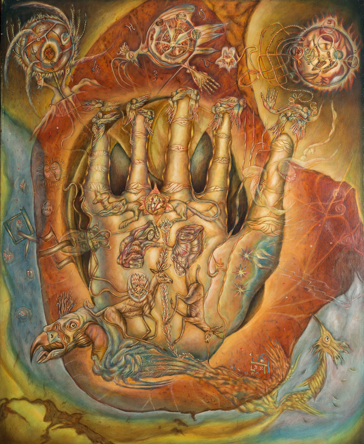 On retrouve dans ces peintures le monde des formes et des métamorphoses, un langage secret de signes, de lettres et de symboles, où est évoqué l’union des contraires, la présence, la plénitude et l’achèvement.