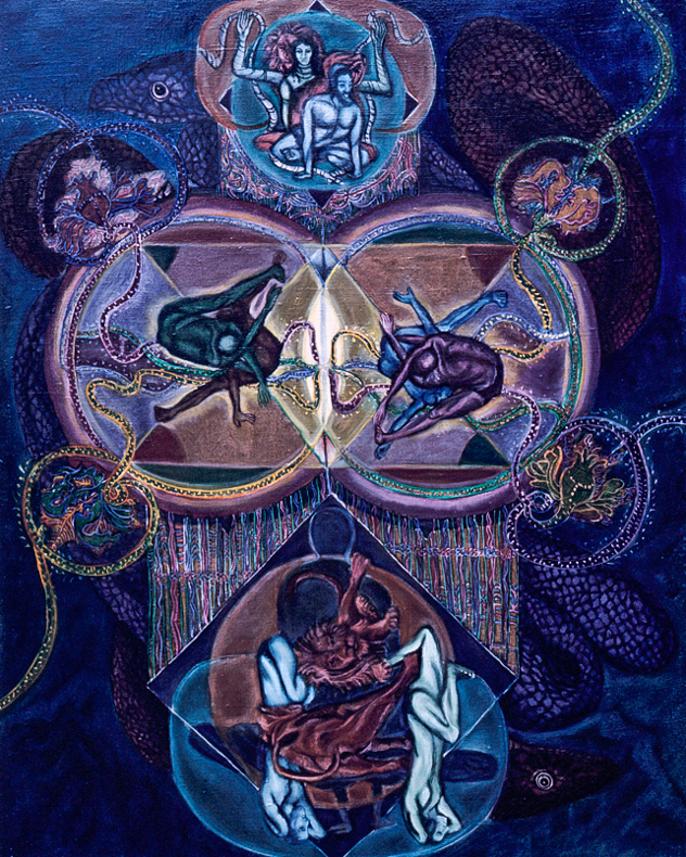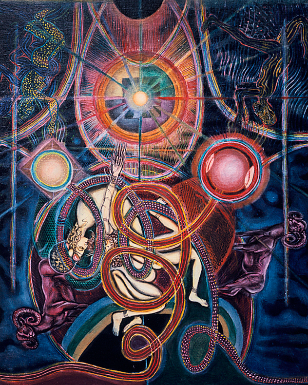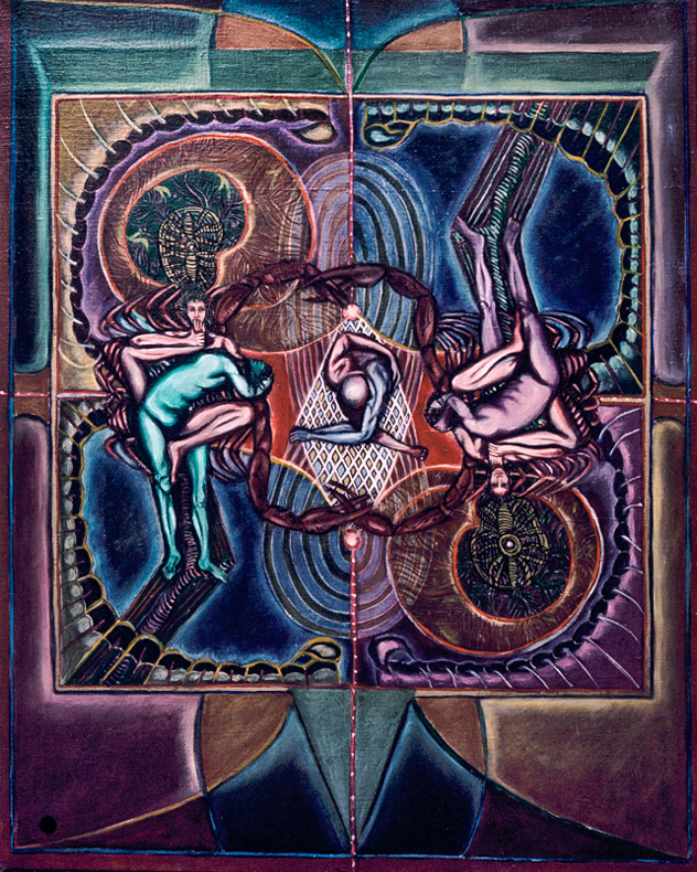 He assembles and modulates the themes of his meditation to engender a series of paintings that connect man to cosmic values.